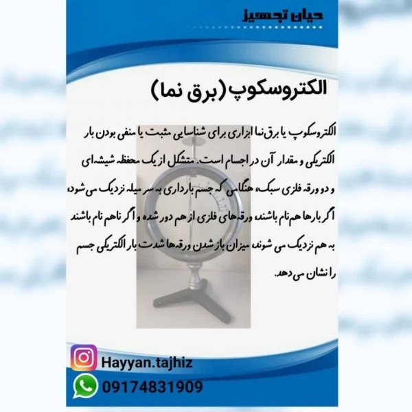 تجهيزات آزمايشگاهي حيان تجهيز الکتروسکوپ يا برقنما ابزاري براي شناسايي مثبت يا منفي بودن بار الکتريکي و مقدار آن در اجسام است. متشکل از يک محفظه شيشهاي و دو ورقه فلزي سبک، هنگامي که جسم بارداري به سر ميله نزديک ميشود، اگر بارها همنام باشند، ورقههاي فلزي از هم دور شده و اگر ناهم نام باشند به هم نزديک مي شوند، ميزان باز شدن ورقهها شدت بار الکتريکي جسم را نشان ميدهد. . .جهت کسب اطلاعات بيشتر با شمارههاي زير تماس بگيريد . 07132332044-09174831909 . . www.digilabsell.com . . جهت سفارش دايرکت در واتساپ پيام بديد . . در صورت تاخير لطفا در واتساپ پيام بديد. تا به شما عزيزان در اسرع وقت پاسخ داده شود . . ???? ارسال به سرتاسر کشور . . تجهيزات آزمايشگاهي حيان تجهيز ارائه کليه موادهاي شيميايي آزمايشگاهي تحقيقاتي و صنعتي و دستگاهي و شيشهآلات آزمايشگاهي و ملزومات مصرفي.???? . . #لوازم_مدارس #لوازم_آزمايش_مدارس #الکتروسکوپ #برق_نما_ملزومات_مدارس
