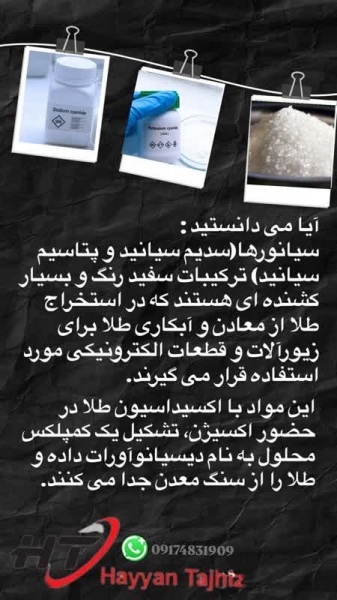 آیا می دانستید سیانورها(سدیم سیانید و پتاسیم سیانید) ترکیبات سفید رنگ و بسیار کشنده ای هستند که در استخراج طلا از معادن و آبکاری طلا برای زیورآلات و قطعات الکترونیکی مورد استفاده قرار می گیرند. این مواد با اکسیداسیون طلا در حضور اکسیژن، تشکیل یک کمپلکس محلول به نام دیسیانوآورات داده و طلا را از سنگ معدن جدا می کنند.