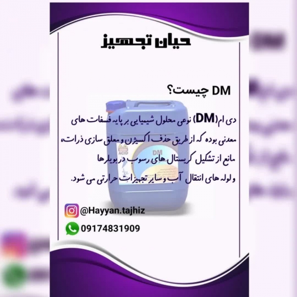تجهيزات آزمايشگاهي حيان تجهيز دي ام(DM) نوعي محلول شيميايي بر پايه فسفات هاي معدني بوده که از طريق حذف اکسيژن و معلق سازي ذرات، مانع از تشکيل کريستال هاي رسوب در بويلرها و لوله هاي انتقال آب و ساير تجهيزات حرارتي مي شود. تجهيزات آزمايشگاهي حيان تجهيز جهت کسب اطلاعات بيشتر با شمارههاي زير تماس بگيريد. 07132332044-09174831909 www.digilabsell.com اينستگرام به آدرس: hayyan.tajhiz جهت سفارش دايرکت در واتساپ پيام بديد. در صورت دير پاسخ دادن در دايرکت لطفا در واتساپ پيام بديد. تا به شما عزيزان در اسرع وقت پاسخ داده شود. ارسال به سرتاسر کشور تجهيزات آزمايشگاهي حيان تجهيز ارائه کليه موادهاي شيميايي آزمايشگاهي تحقيقاتي و صنعتي و دستگاهي و شيشهآلات آزمايشگاهي و ملزومات مصرفي. #دي_اسکلر #DM #ضد_رسوب_بويلر #ضد_رسوب_ديگ_بخار