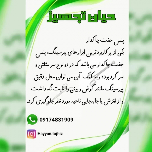 تجهيزات آزمايشگاهي حيان تجهيز پنس جفت چاکدار يکي از پرکاربردترين ابزارهاي پيرسينگ، پنس جفت چاکدار مي باشد که در دو نوع سر مثلثي و سر گرد بوده و به کمک آن مي توان محل دقيق پيرسينگ مانند گوش و بيني را ثابت نگه داشت و از لغزش يا جابهجايي ناحيه مورد نظر جلوگيري کرد. . . . .جهت کسب اطلاعات بيشتر با شمارههاي زير تماس بگيريد. . . 07132332044-09174831909 . . www.digilabsell.com . . جهت سفارش در واتساپ پيام بديد . . در صورت تاخير در پاسخگويي لطفا در واتساپ پيام بديد. تا به شما عزيزان در اسرع وقت پاسخ داده شود . . ارسال به سرتاسر کشور . . تجهيزات آزمايشگاهي حيان تجهيز ارائه کليه موادهاي شيميايي آزمايشگاهي تحقيقاتي و صنعتي و دستگاهي و شيشهآلات آزمايشگاهي و ملزومات مصرفي . #پيرسينگ #پنس_پيرسينگ #پنس_سپتوم #پنس_چاکدار #پنس جفت #پيرسينگ_گوش